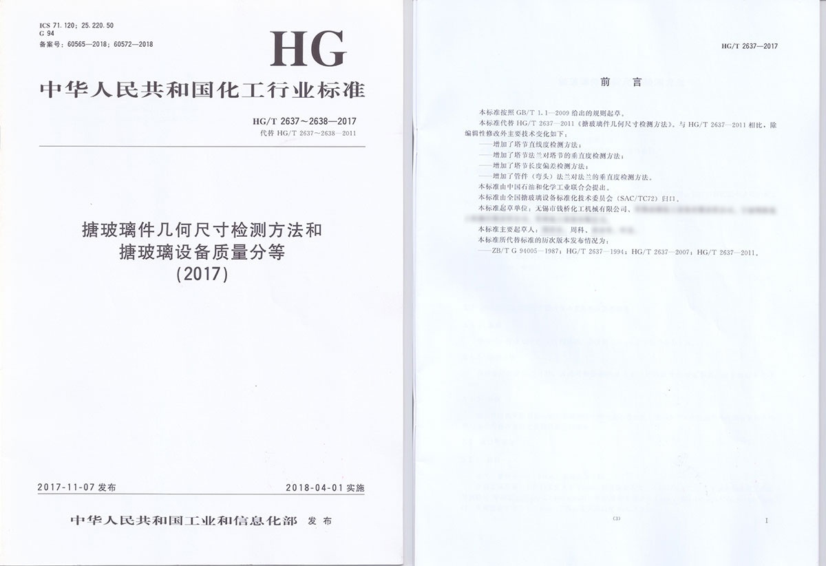 無錫錢橋化工機械有限公司參與起草中華人民共和國化工行業(yè)標準HG/T 2637~2638-2017《搪玻璃件幾何尺寸檢測方法和搪玻璃設(shè)備質(zhì)量分等》。