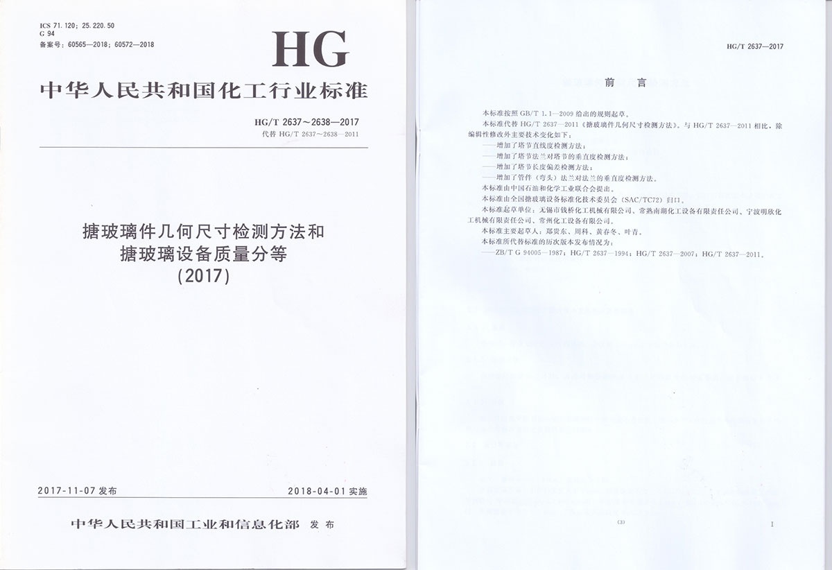 Wuxi Qianqiao Chemical Machinery Co., Ltd. participated in the drafting of the people's Republic of China chemical industry standard Hg / T 2637-2017 detecting methods of geometry dimension for glass-lined parts.