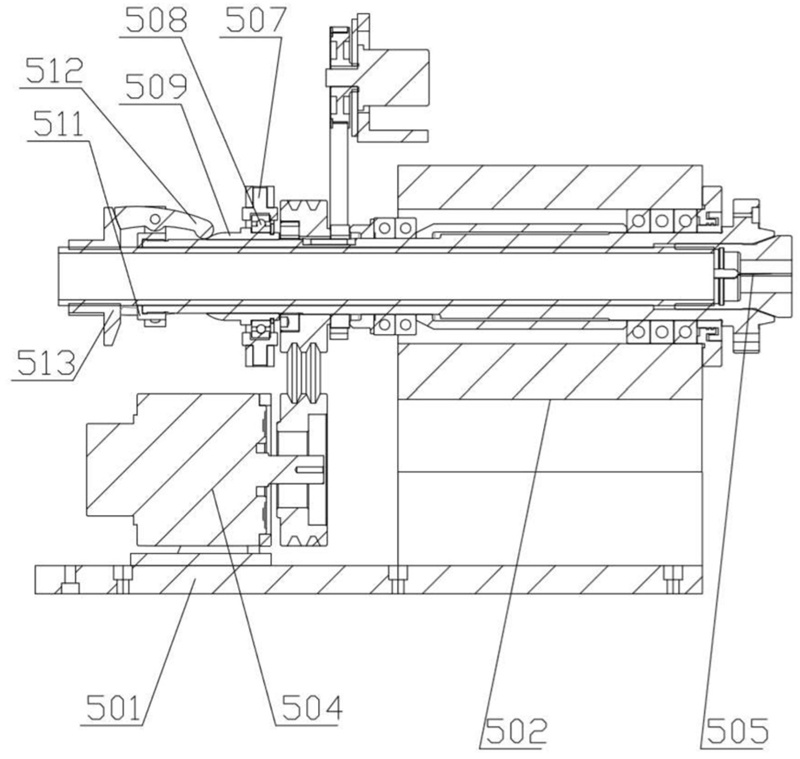 在一些實(shí)施方式中,第一夾持部包括第四安裝板、主軸箱、附加夾頭和旋轉(zhuǎn)驅(qū)動(dòng)件,主軸箱設(shè)置在第四安裝板上,主軸箱遠(yuǎn)離卡盤的一側(cè)設(shè)有附加夾頭,旋轉(zhuǎn)驅(qū)動(dòng)件驅(qū)動(dòng)主軸箱。