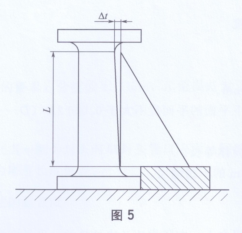 將被測管子法蘭端放置在平臺上,在緊靠法蘭邊處墊放一平行度標(biāo)準(zhǔn)圓墊塊,用直角尺貼靠在管壁上(如圖5所示),旋轉(zhuǎn)管子,用塞尺量取旋轉(zhuǎn)一周中管子上端與直角邊的最大距離△t,此值即為管件法蘭對管子的垂直度。