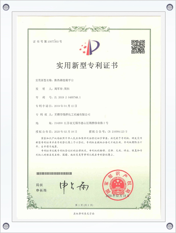換熱器組裝平臺(tái)專利證書